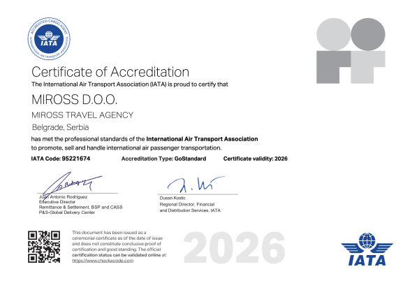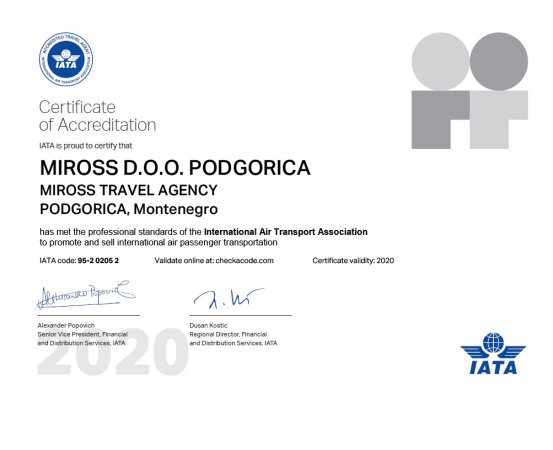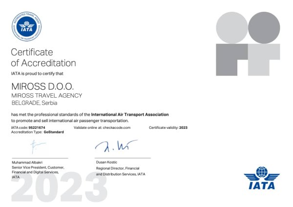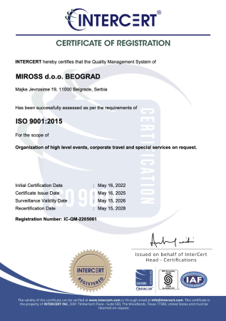 Miross implementira i sertifikovan je ISO 14001:2015, ISO 10002:2014, ISO 9001:2008, ISO 9001:2015, ISO 27001:2013, SecurityMetrics sertifikatima, akreditovan od strane IATA i ICCA.