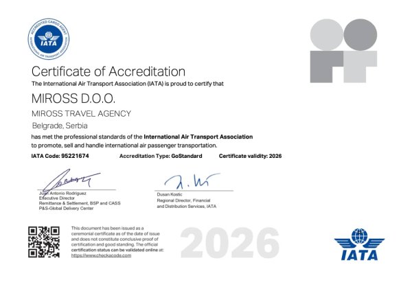 Za više od 30 godina postojanja Miross D.O.O je, kao vodeća agencija kongresnog turizma na tržištu Republike Srbije i Crne Gore, dobitnik više od 100 različitih nagrada i priznanja za svoj rad kao i doprinos razvoju tržišta. Stalnim, rigoroznim, procesom sertifikacije Miross redovno testira i potvrđuje kvalitet svojih poslovnih procesa, bezbjednosti informacija i ukupnog poslovanja.