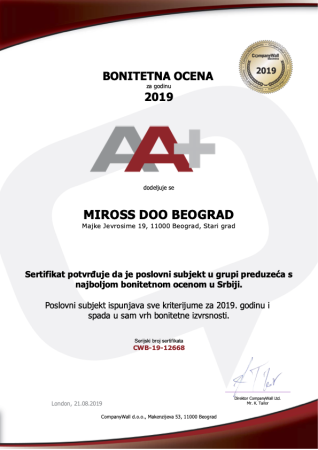 Za više od 30 godina postojanja Miross D.O.O je, kao vodeća agencija kongresnog turizma na tržištu Republike Srbije i Crne Gore, dobitnik više od 100 različitih nagrada i priznanja za svoj rad kao i doprinos razvoju tržišta. Stalnim, rigoroznim, procesom sertifikacije Miross redovno testira i potvrđuje kvalitet svojih poslovnih procesa, bezbednosti informacija i ukupnog poslovanja.